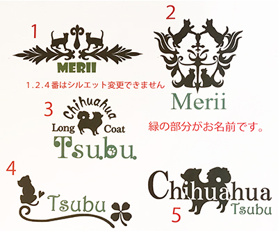 小さな家族の名前を入れることができるオリジナルデザインの「名前入り」と、犬種とシルエットのみのシンプルな「名前なし」のタイプがあります。